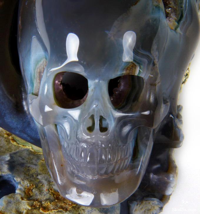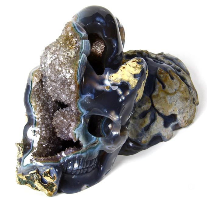 You are looking at a Agate Amethyst Geode skull. The skull is 9.3 inches from front to back.