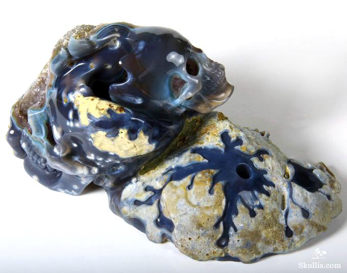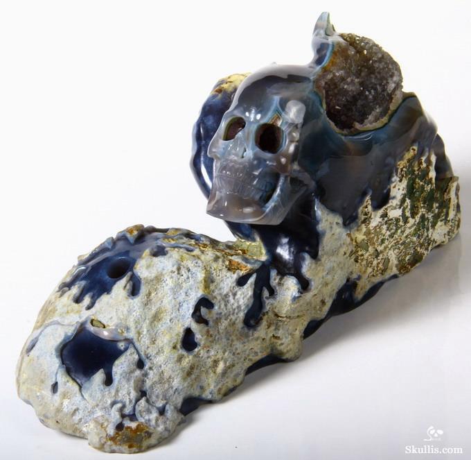 5.4" Agate Amethyst Geode Hand Carved Crystal Skull Fine Art Sculpture, Crystal Healing