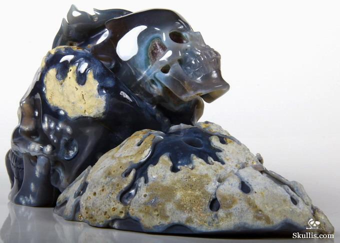 8.4" Agate Amethyst Geode Hand Carved Crystal Skull and Dolphins Fine Art Sculpture, Crystal Healing
