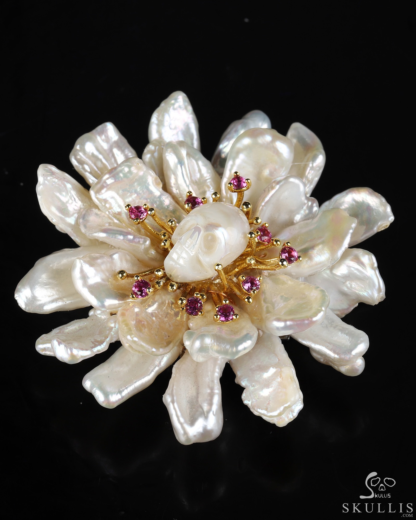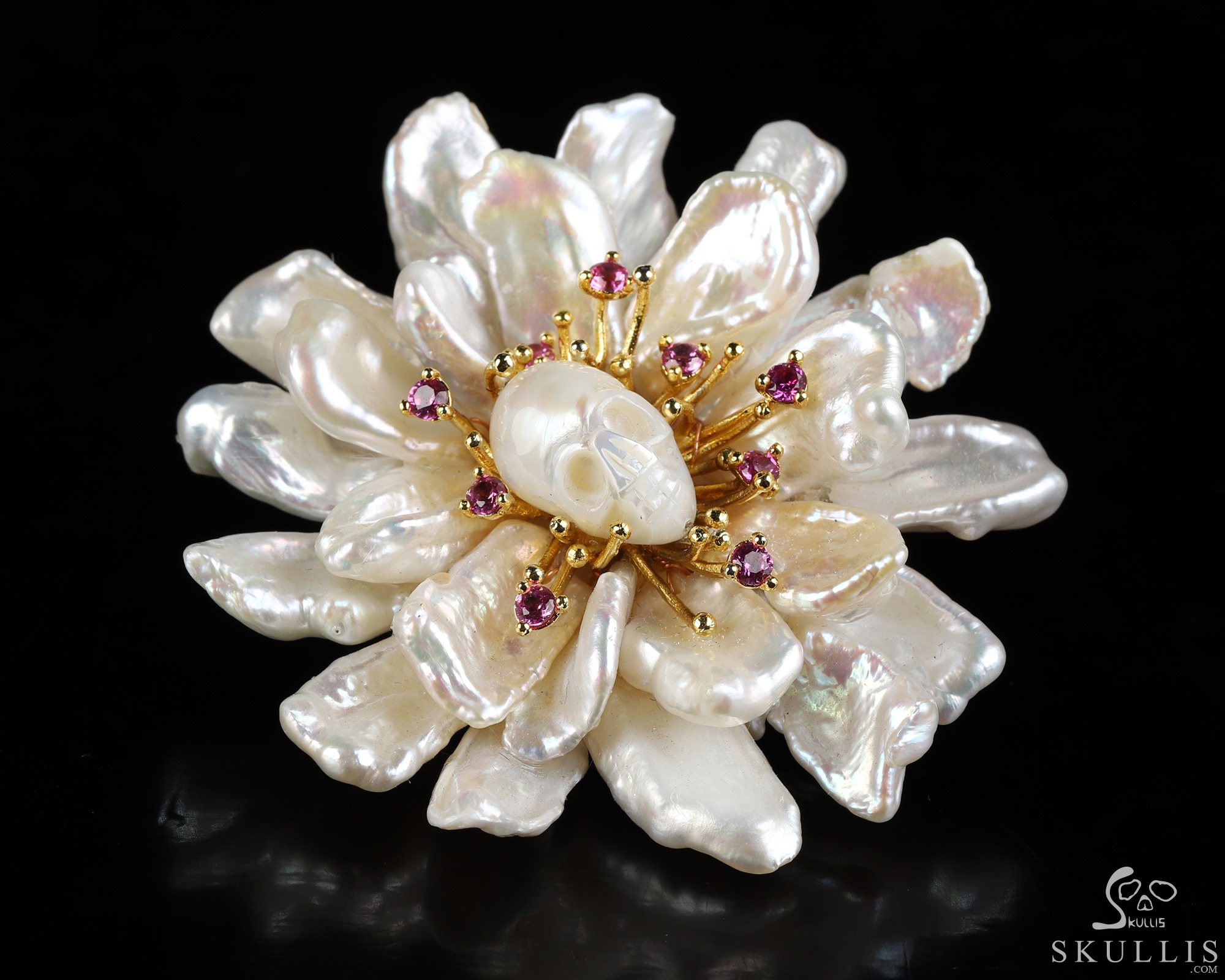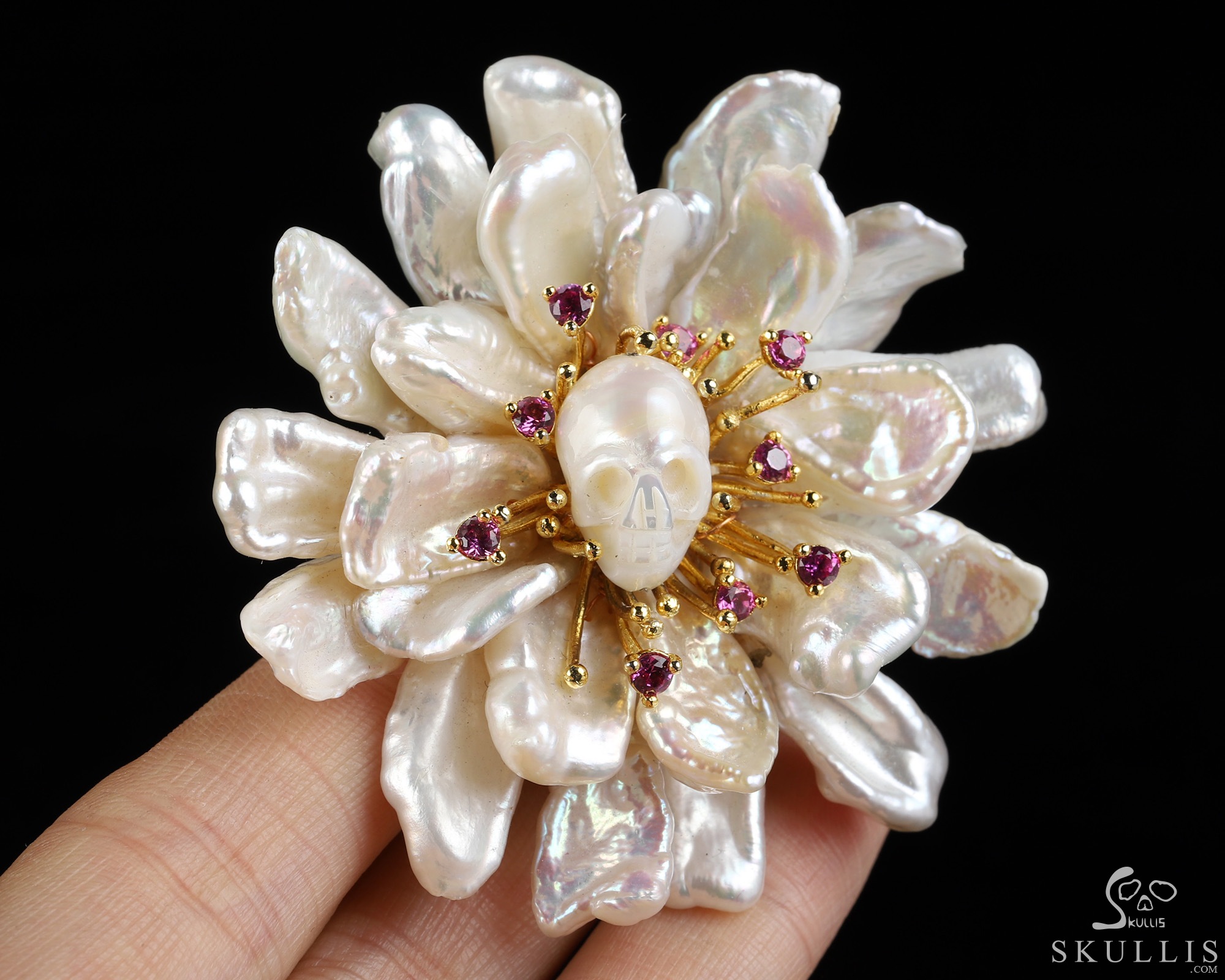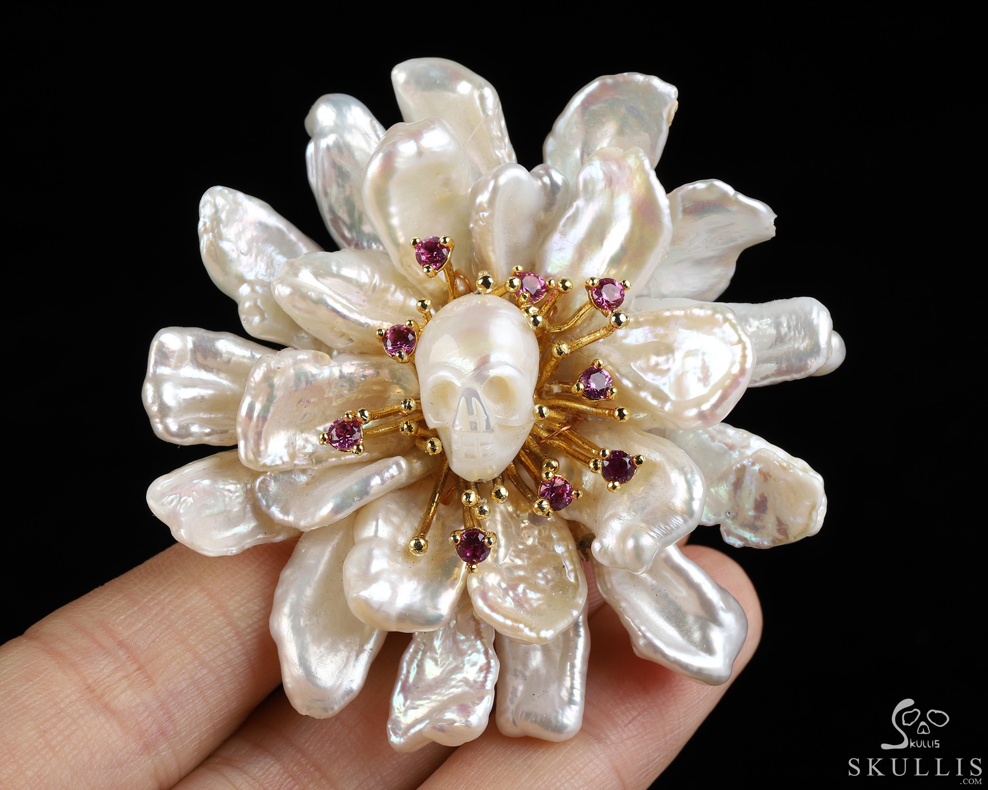 Gemstone Amethyst Hand Carved Crystal Skull Brooch, 18K Gold-Plated 925 Silver, Skull Jewelry