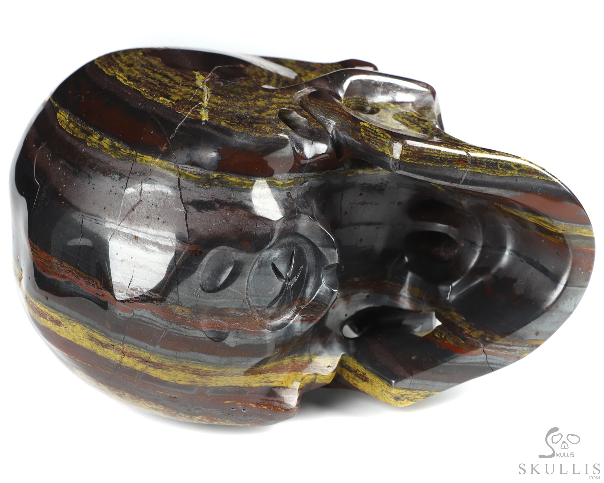 You are looking at a Colorful Tiger Iron Eye skull. The skull is 6.5 inches long from front to back.