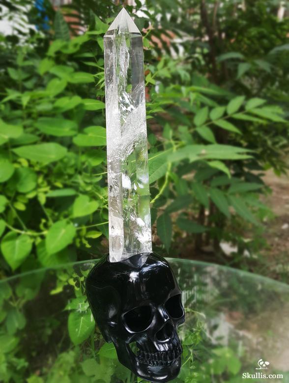 The Source of the Energy - Huge 5.0" Black Obsidian Carved Crystal Skull Sculpture with Clear Quartz Rock Crystal Point