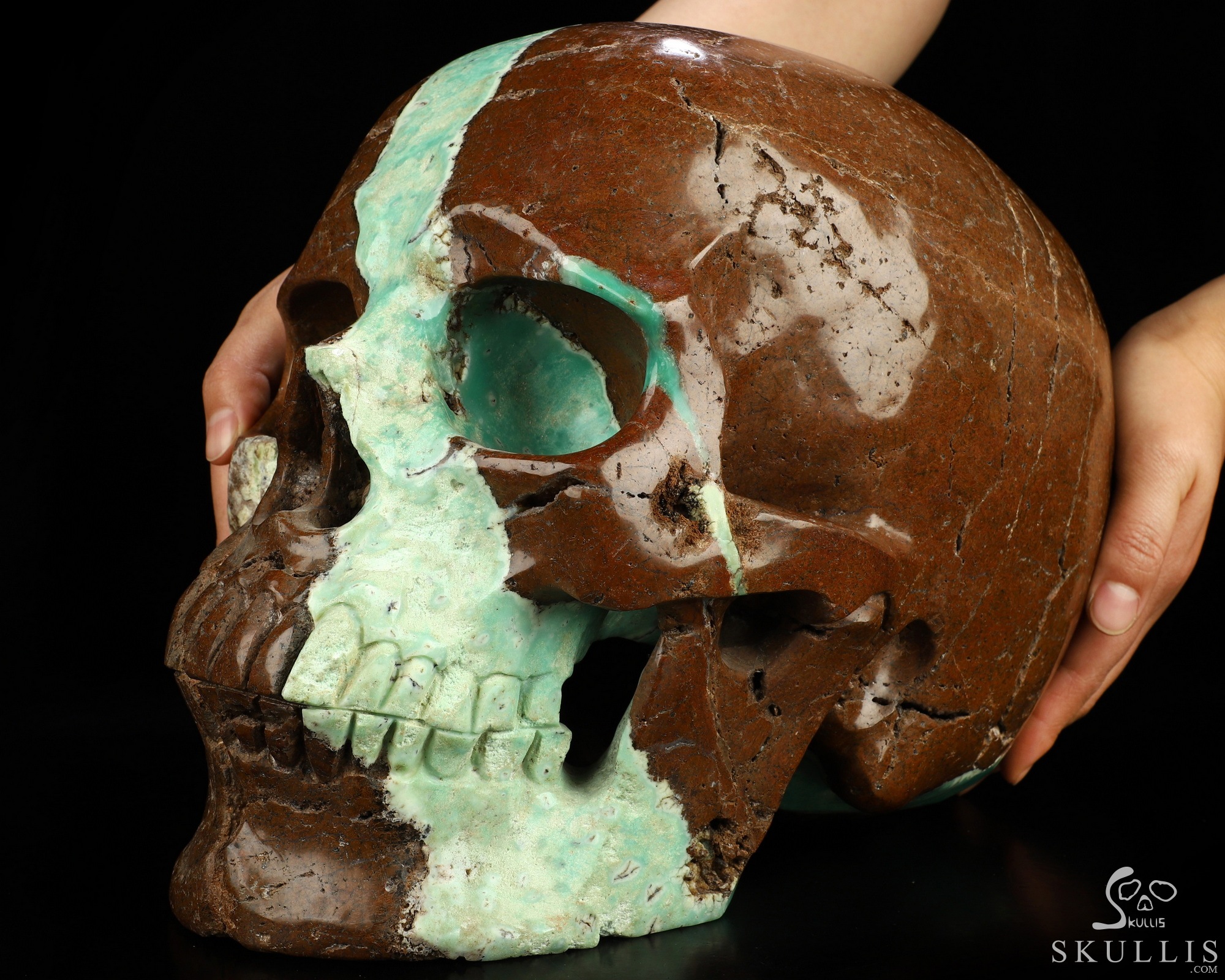 Gemstone 11.9" Chrysoprase Matrix Hand Carved Crystal Skull Fine Art Sculpture, Crystal Healing