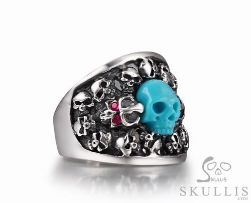 Turquoise & 925 Sterling Silver Carved Skull with Ruby in 925 Sterling Silver Skulls Ring - Skullis Exclusive
