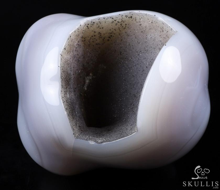 You are looking at a Agate Geode skull. The skull is 3.9 inches long from front to back.