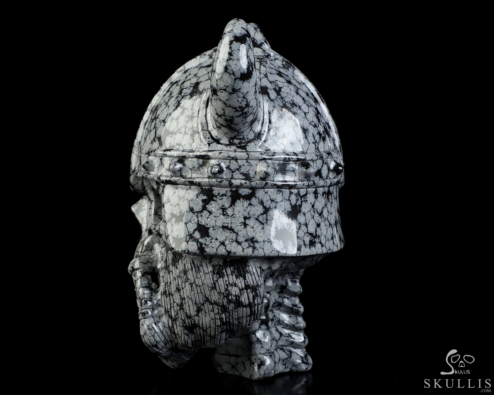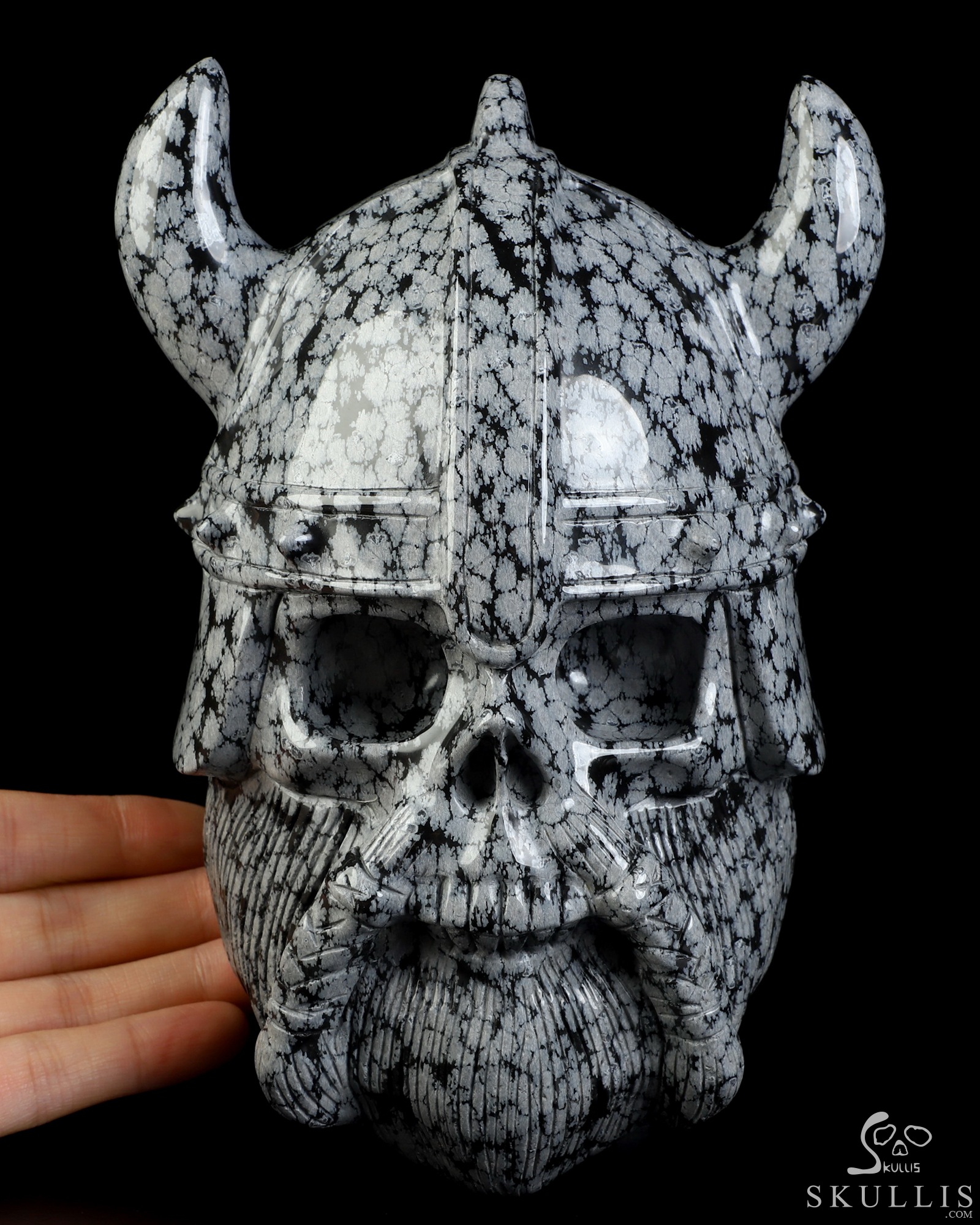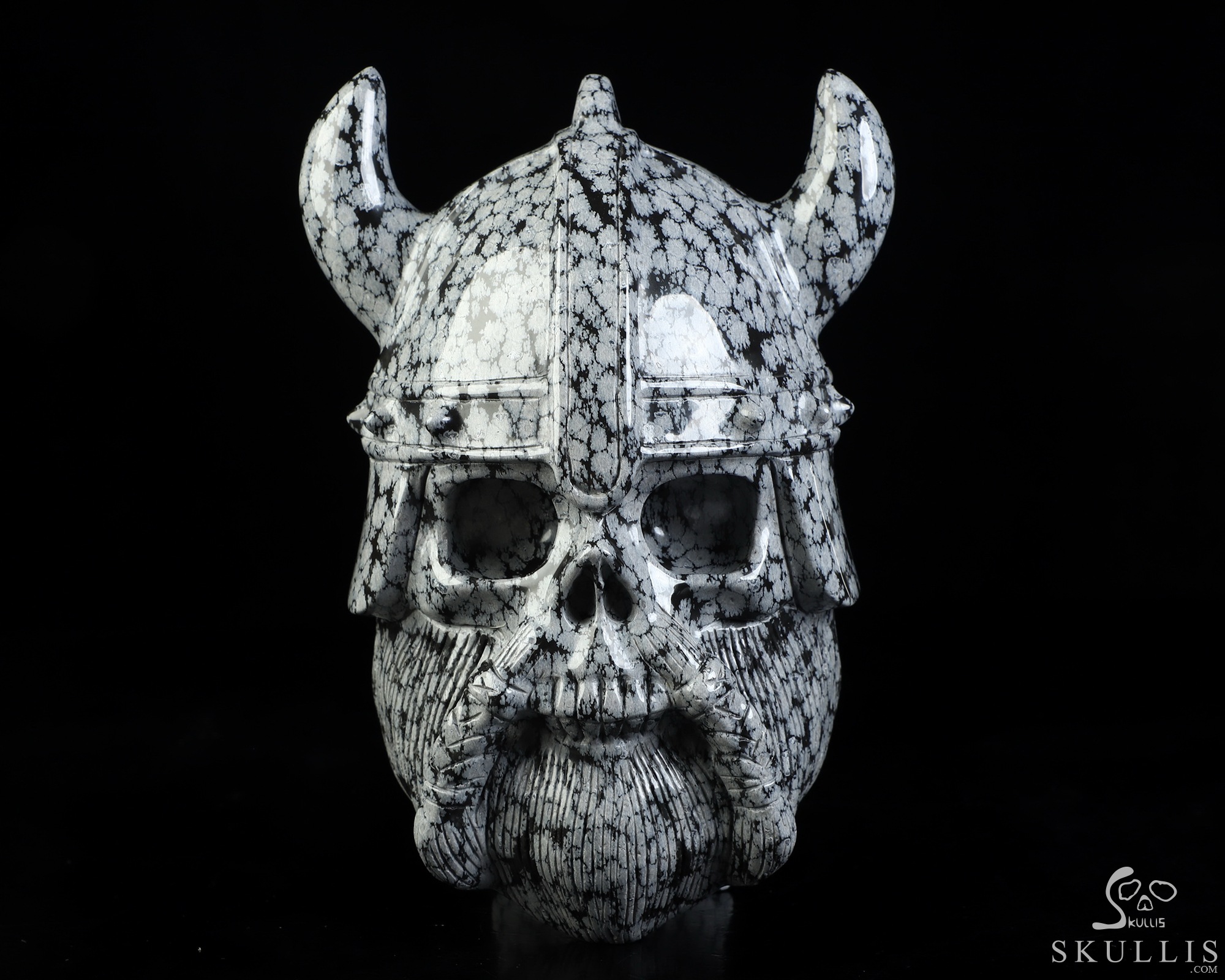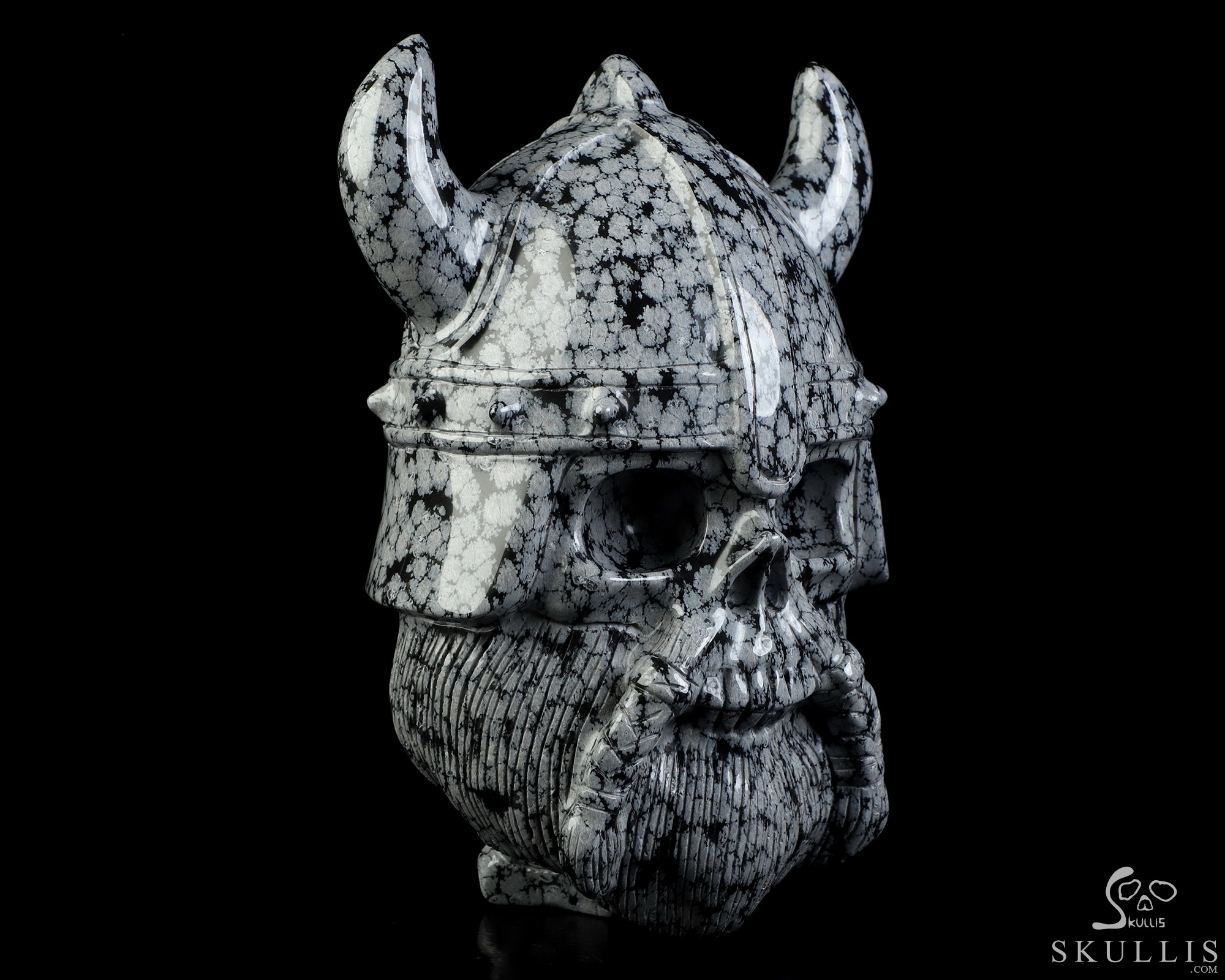 Viking Skull, 6.9" Snowflake Obsidian Hand Carved Crystal Skull Fine Art Sculpture, Crystal Healing